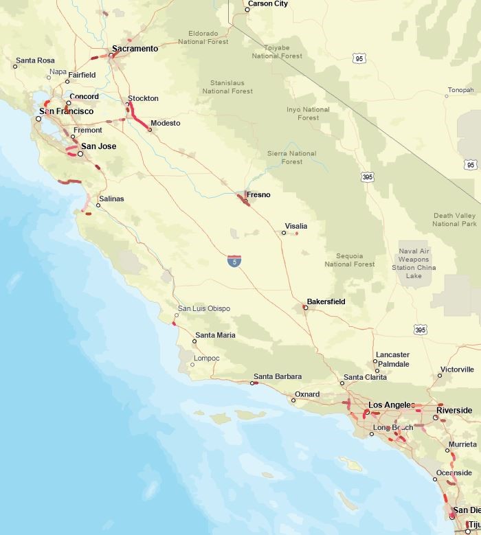 Description: Bottleneck Mapping is a subproject of the Mobility Performance Report, which is one of the products of the Mobility Performance Reporting and Analysis Program (MPRAP). The Mobility Performance Report is prepared by the California Department of Transportation (Caltrans) and District staff to provide detailed data about highway system performance related to congestion and mobility. Caltrans collects vehicle counts and calculates speeds at all hours of the day and all days of the week in major metropolitan areas throughout California via the Caltrans Performance Measurement System (PeMS--see Data Source tab). This information helps identify congestion bottlenecks and results in more cost-effective investments to improve the performance of the State Highway System.
